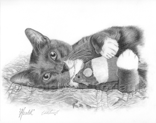 Ms. Christine Kola commissioned this first portrait of her cat Hamlet.  Two main reference photographs were used to create this delightful pose.